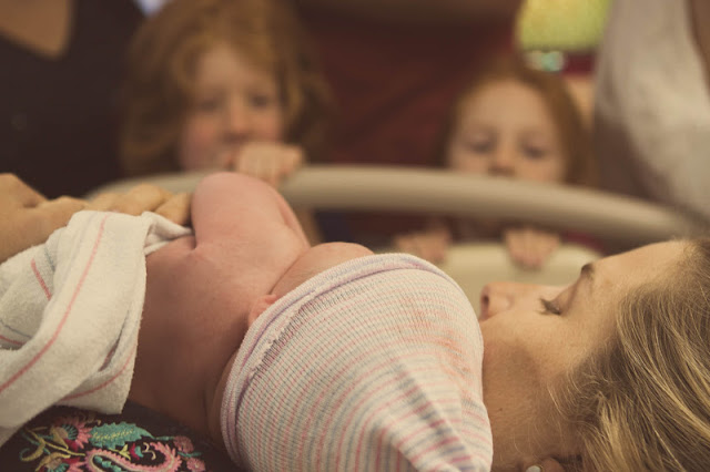 Sure enough, she was right, it was time. But I wasn't fully dilated. She told me to push anyways, if that's what my body was doing. My bag of water was about to burst and she knew how I labored....knew that once my bag broke I'd be complete. So she encouraged me to push against the bag if that's what I wanted to do. A few contractions later, though, she asked to break it and I was happy to let her! Once broken, I was complete and Arrow was on his way into the world. I geared myself up for the horrible "ring of fire" that I remembered from Kian's birth, my only other med free delivery. But amazingly, Arrow didn't hurt that bad. I can only assume its because I was in more control, and was in "the zone" way more this time around. I was even able to know what was going on around me. Poor Logan was having a hard time watching the pushing stage, and I remember having enough control to try and console him, while pushing. Once Arrow's head was out, our midwife told Zac to help with the rest. At 9:49 a.m., not even 3 hours after early labor started, our son was born into his Daddy's hands, and placed into my arms.